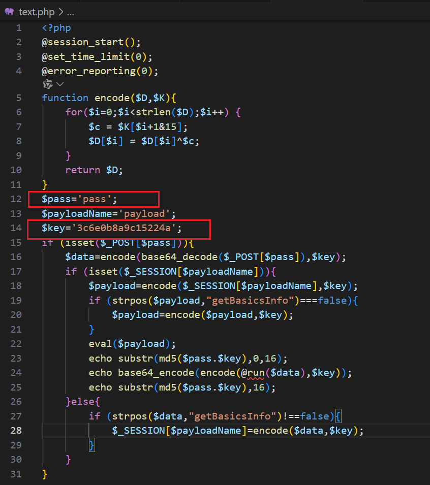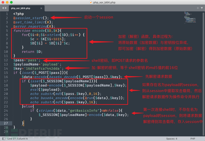 PHP_XOR_BASE64类型的加密shell的服务器端代码如下,其中定义了encode函数,用于加密或解密请求数据。由于是通过按位异或实现的加密,所以encode函数即可用于加密,同时也可用于解密。