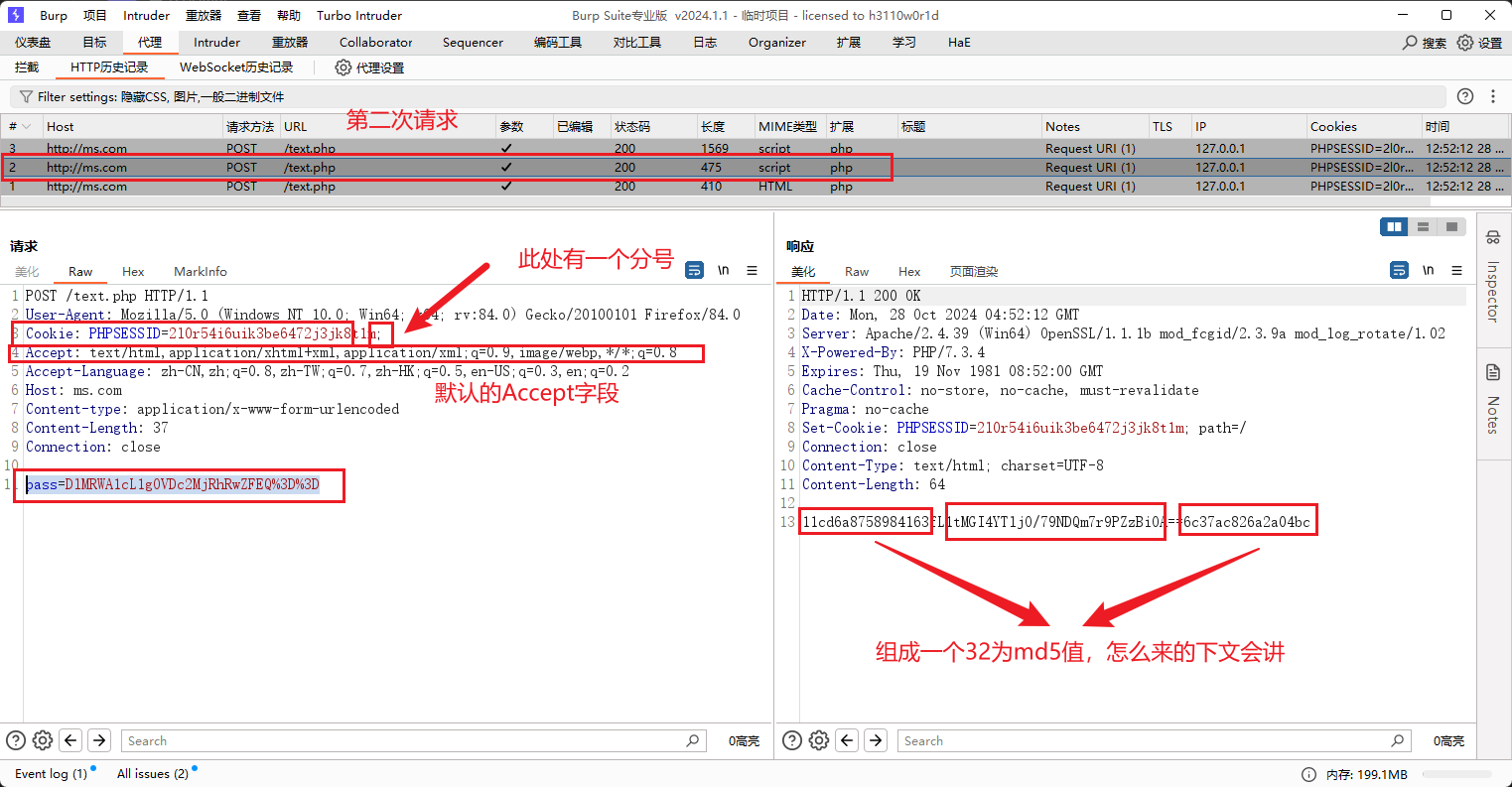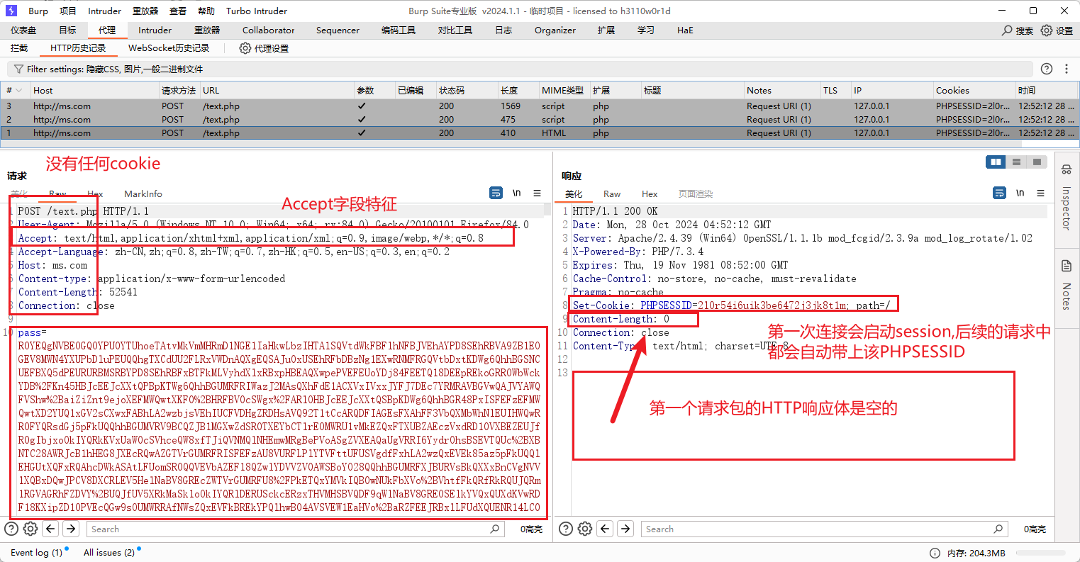 通过Burp抓包可知,第1个请求会发送大量数据,该请求不含有任何Cookie信息,服务器响应报文不含任何数据,但是会设置PHPSESSID,后续请求都会自动带上该Cookie,第一次请求的数据包通常要比后面两个数据包要大,而且第一个请求包的http响应体是空的: