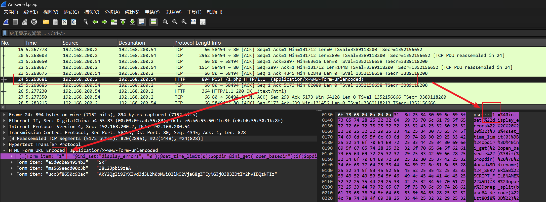 这个随便找到一个HTTP包,第一个键值对的属性一般就是密码,因为他的值有@ini_set(“display_errors”, “0”);@set_time_limit(0)的特征,所以他的密码为1