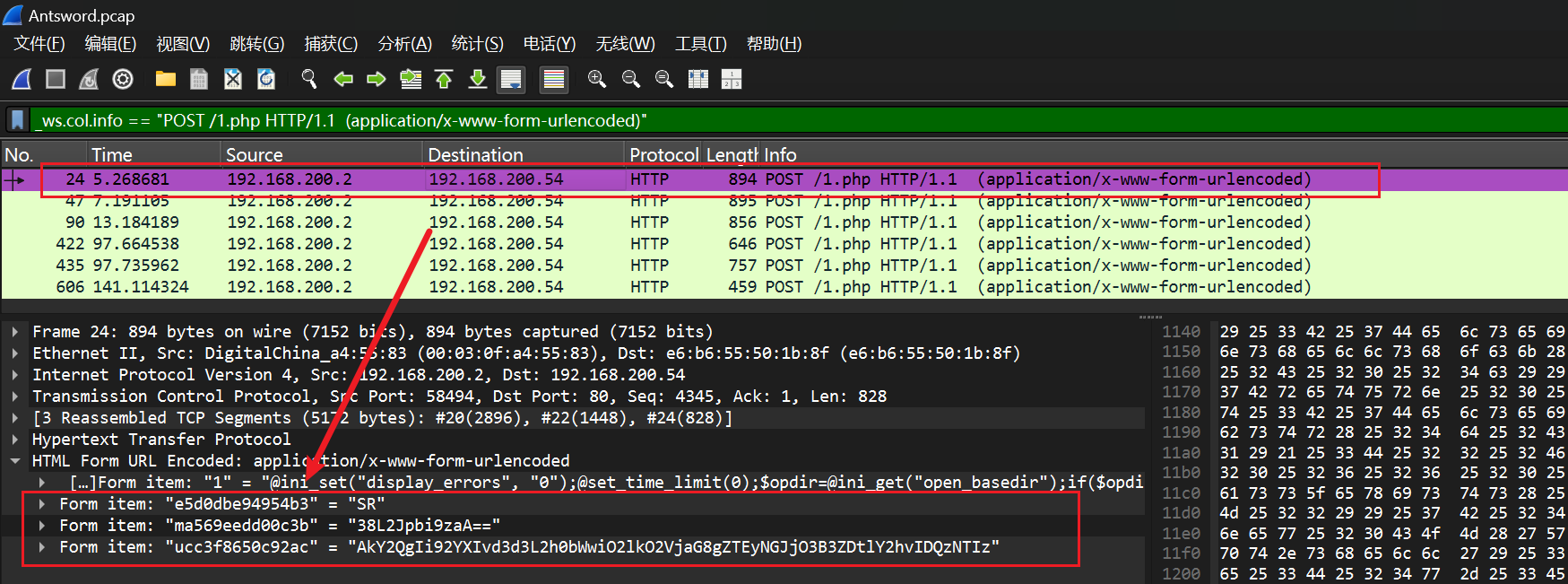过滤出所有的请求包,选中第一个,看到他的请求包中是四个参数,第一个参数就是我们之前看到的执行命令时的四个数据包,第一个包就是执行的源码,第二个命令是加密参数,这里是空,第三个参数是shell类型,第四个参数就是他执行的命令