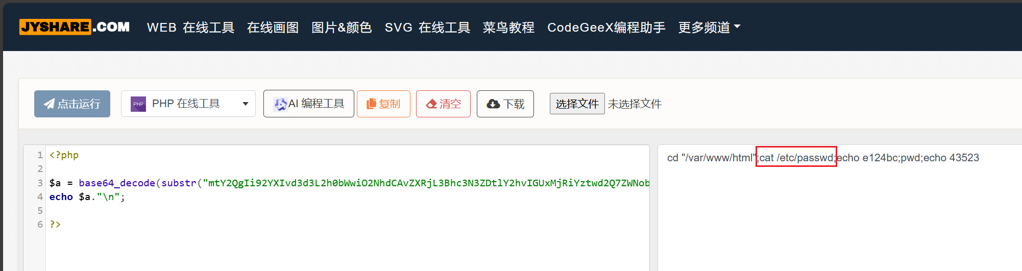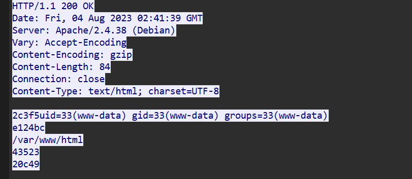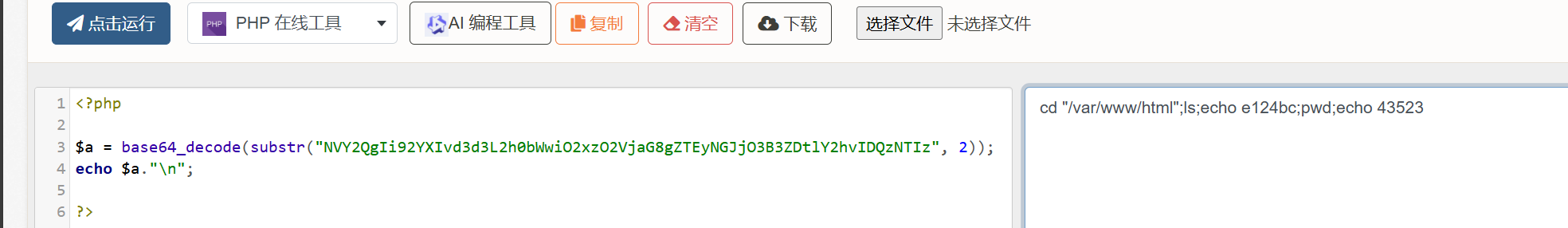 可以看到当前路径是/var/www/html,第一个命令执行了id,然后输出了一个字符串又查看了当前路径