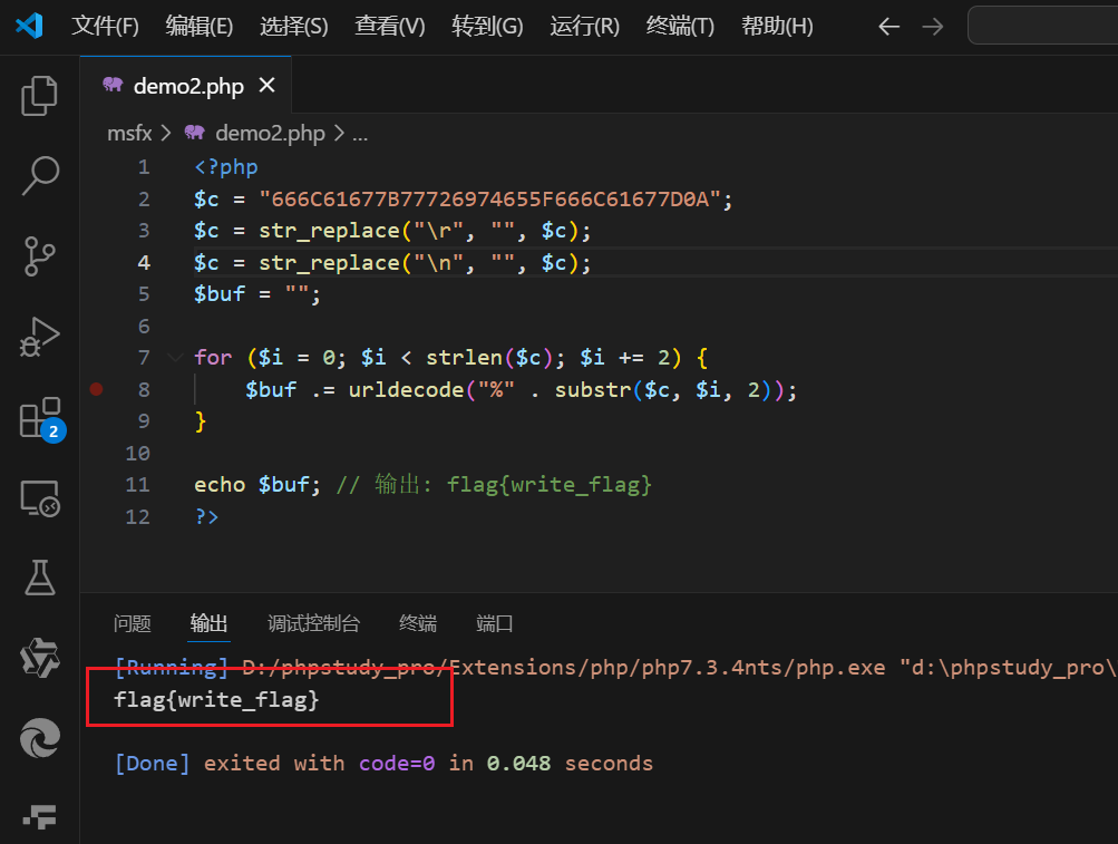 发现第三个参数接收的是文件名称,是使用fwrite函数进行写入的,解码看一下,是写到/var/www/html/flag.txt文件中的
