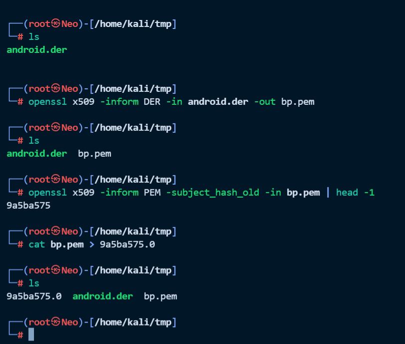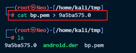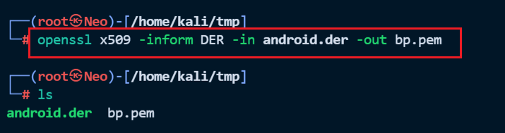 - 作用:将 android.der(DER 格式的证书)转换为 PEM 格式,并保存为 bp.pem。