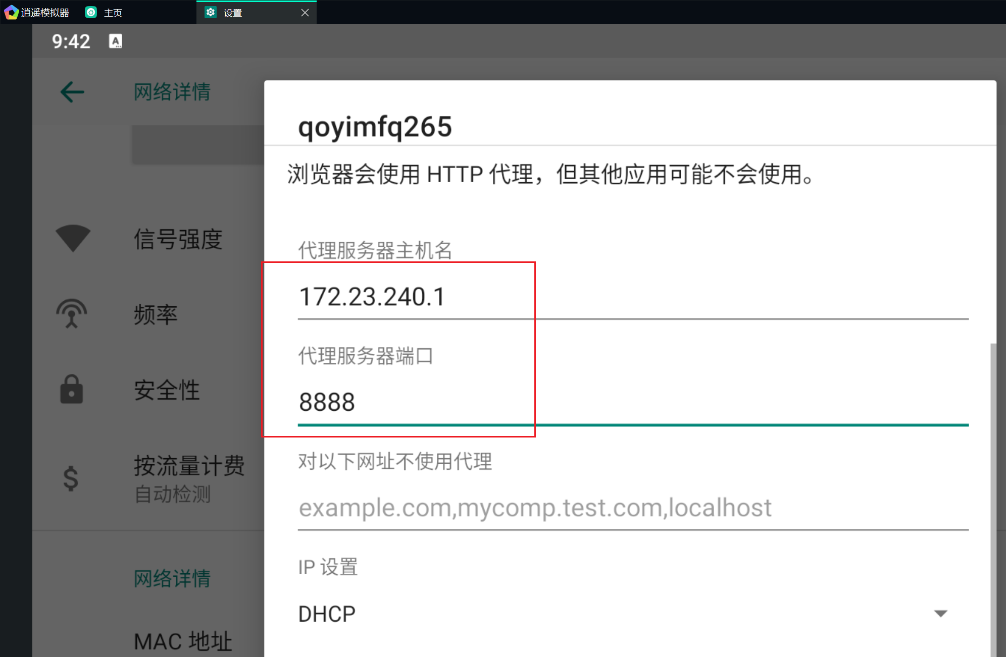 这里代理设置为自己的ip地址,不要设置成127.0.0.1,不然模拟器流量不从这个端口走